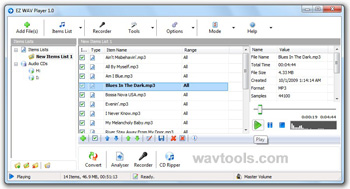 EZ WAV Player có thể chơi và chuyển đổi tập tin WAV, ACM, MP3, WAV PCM, WMA và nhiều tập tin khác dễ dàng nhanh chóng với kết quả có chất lượng cao. Với Item Editor của EZ WAV Player bạn có thể có được chi tiết về mục trong danh sách. Bạn cũng có thể thiết lập phạm vi xử lý và ID3 tag của âm thanh kết quả.
